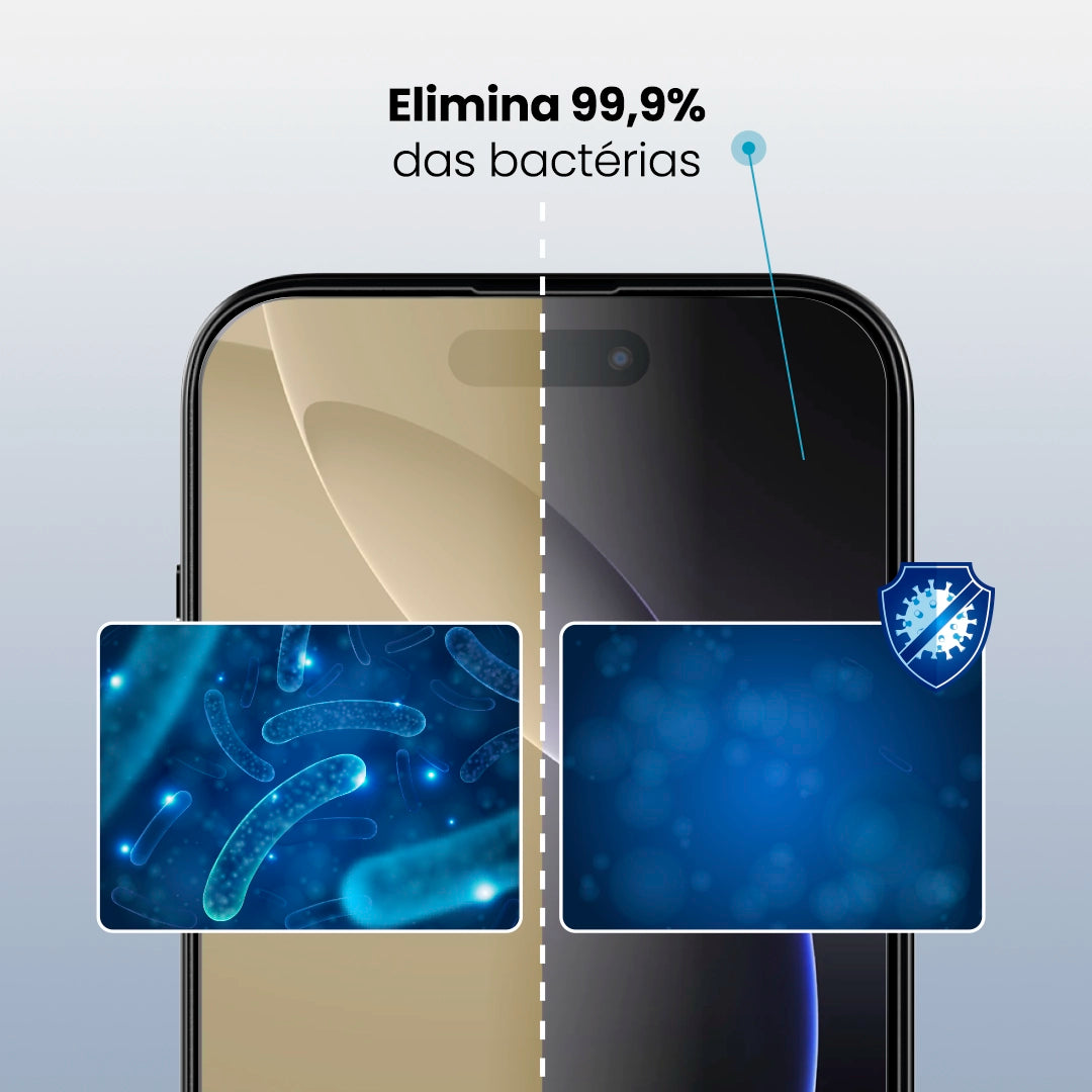 Revestida com íons de prata, a película elimina até 99% das bactérias que ficam em contato com a tela, oferecendo mais higiene para quem usa o celular o tempo todo.