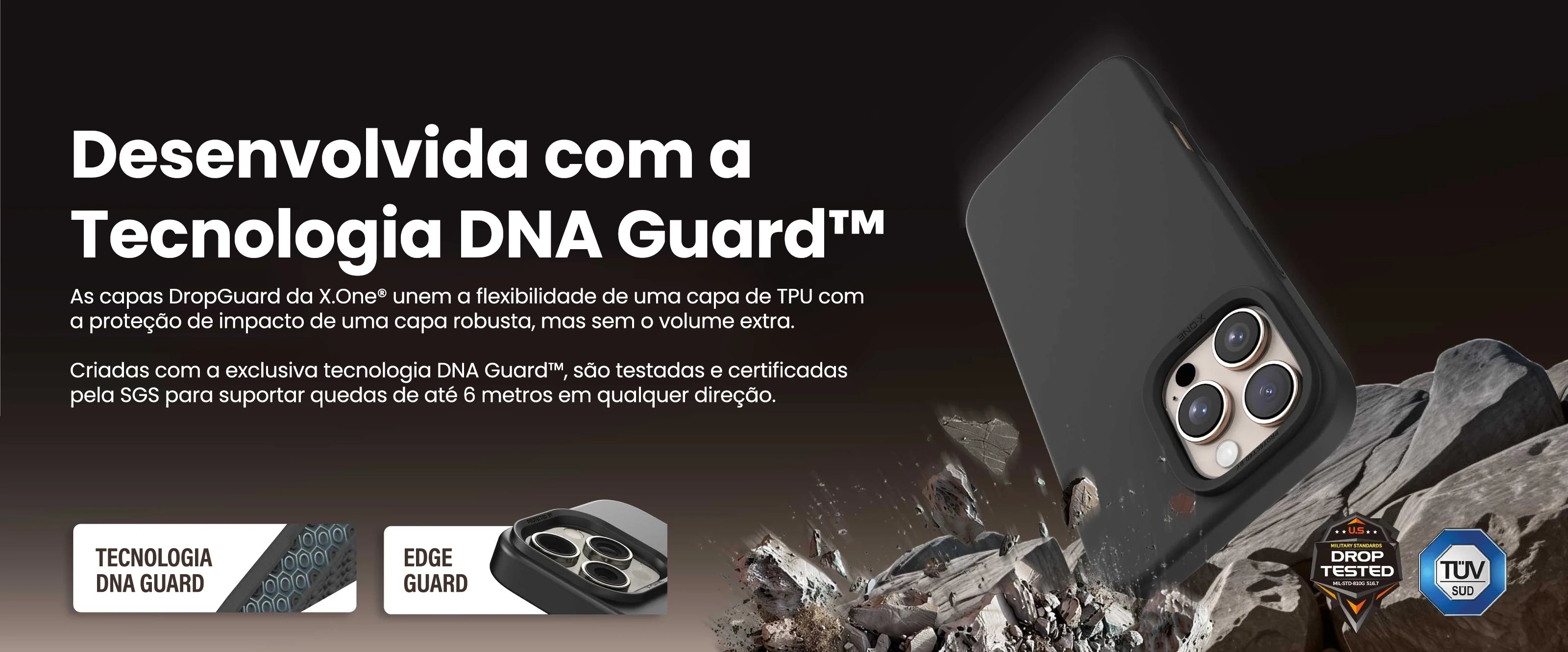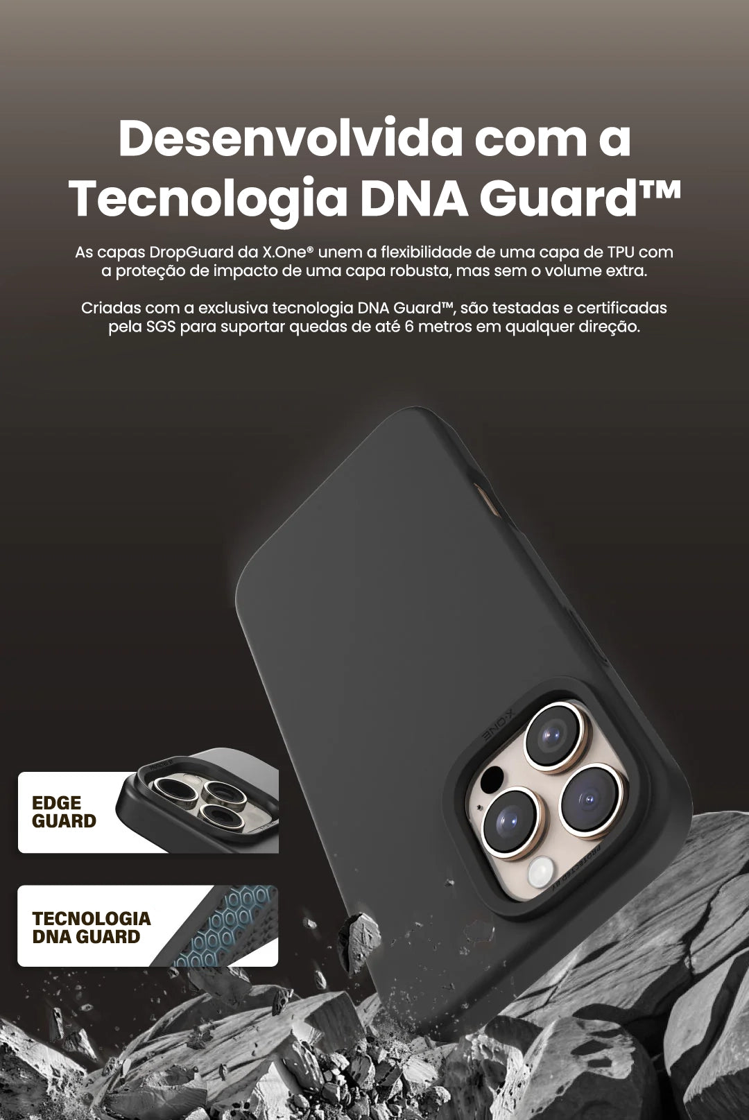 A exclusiva tecnologia DNA Guard combina um design estruturado inspirado no DNA com polímeros de alta performance, garantindo até 30% mais absorção de impacto em comparação com capas comuns. Mais segurança em cada detalhe.