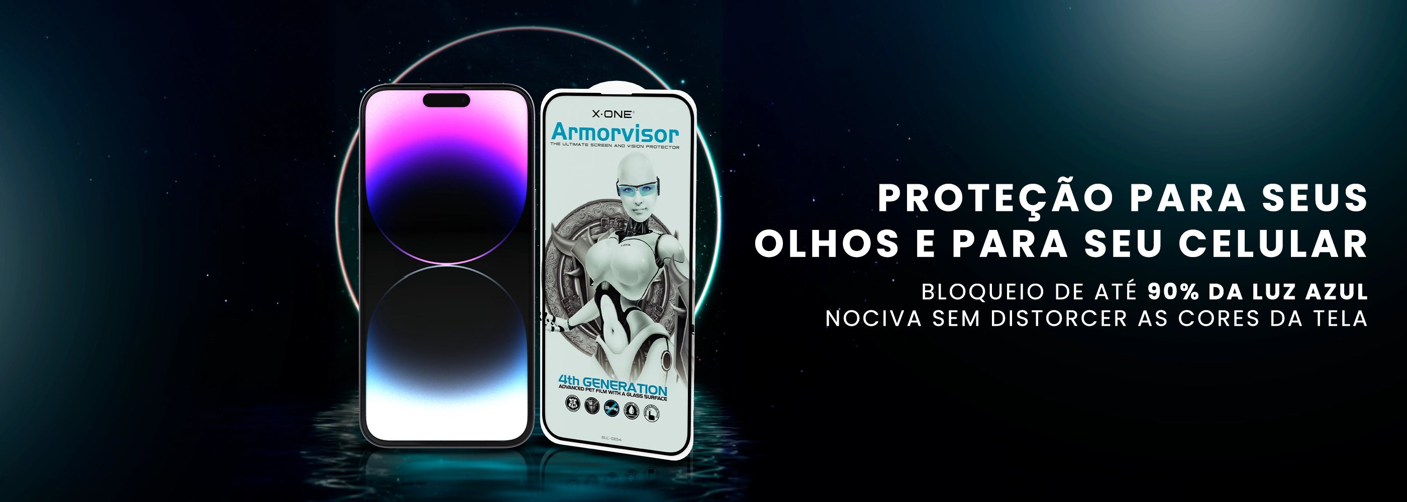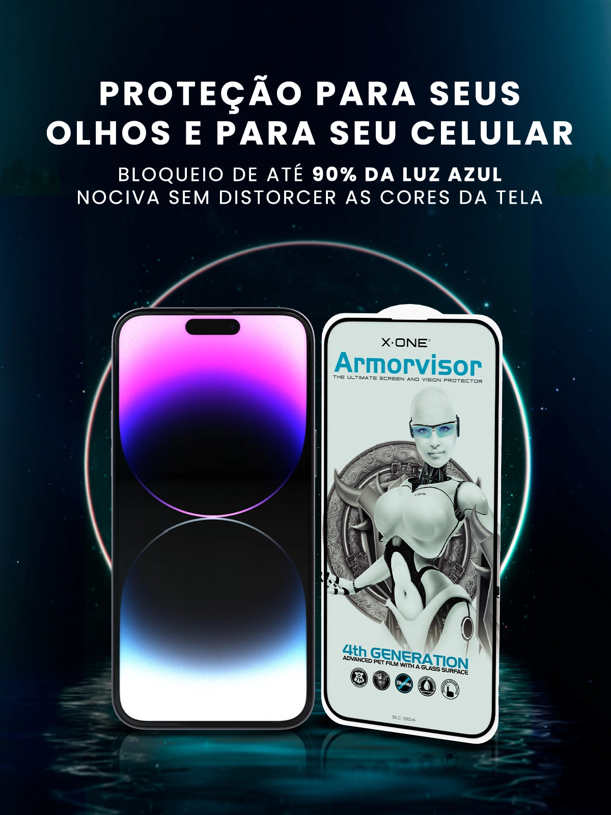 A película Armorvisor bloqueia até 90% da luz azul nociva emitida pela tela do celular, reduzindo a fadiga ocular, melhorando o sono e evitando riscos a longo prazo para sua saúde visual.